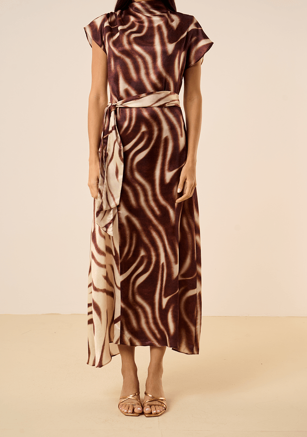 Vestido Maria.Valentina Ajustado Gola Alta Manga Curta Midi Marrom