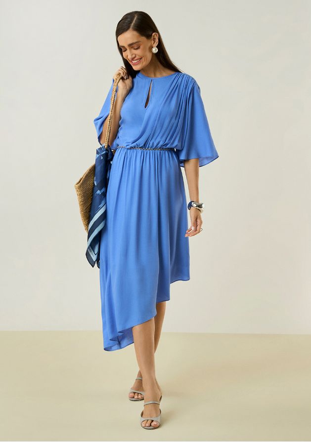 Vestido Maria.Valentina Ajustado Decote Careca Manga Curta Midi Azul