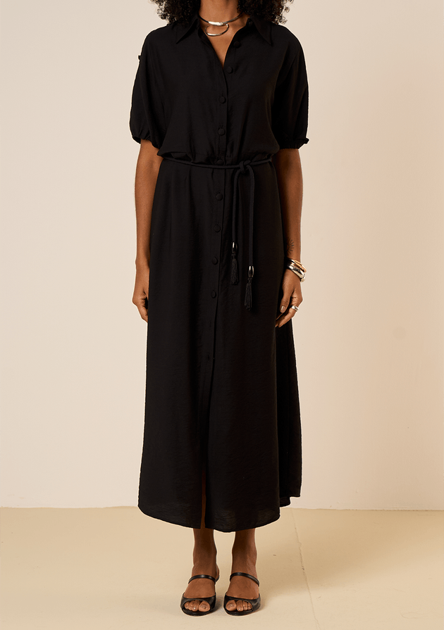 Vestido Maria.Valentina Solto Decote Careca Manga Curta Longo Preto