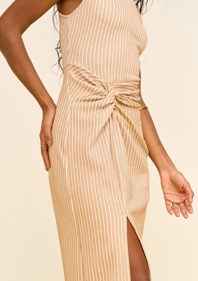 Vestido Zinco Ajustado Decote Careca Sem Manga Midi Bege