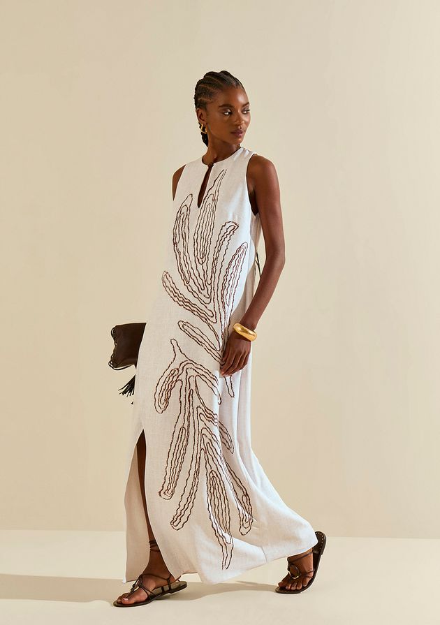 Vestido Morena Rosa Solto Decote Careca Sem Manga Longo Bege