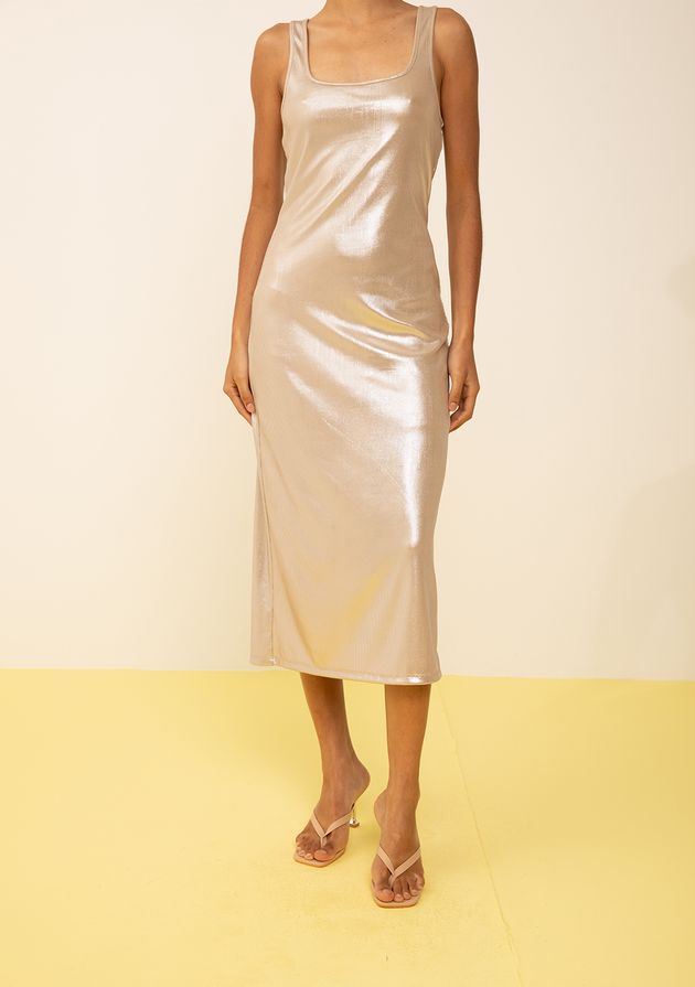 Vestido Zinco Ajustado Decote Reto Sem Manga Midi Bege