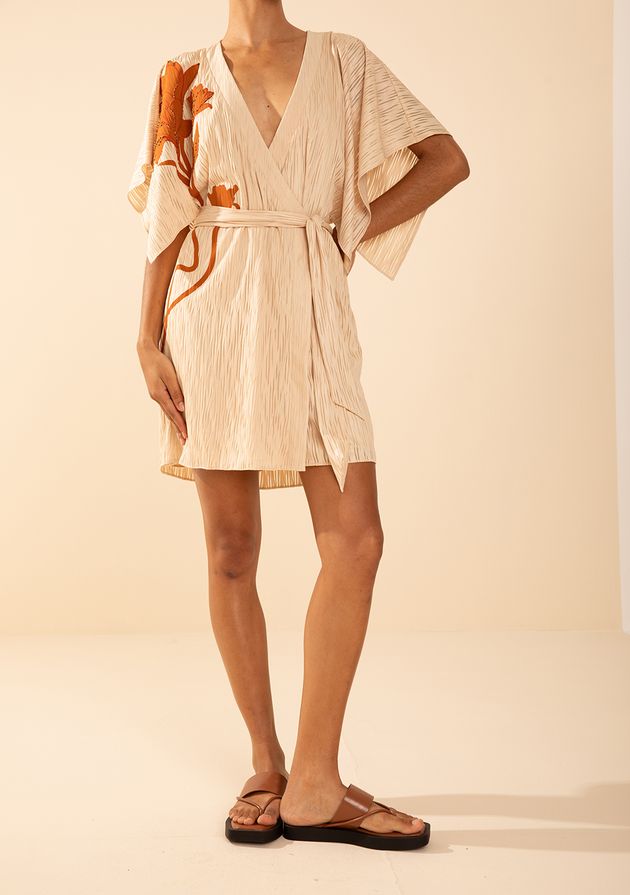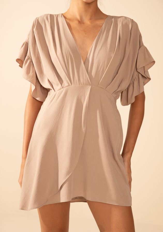 Vestido Morena Rosa Solto Decote V Manga Curta Curto Bege