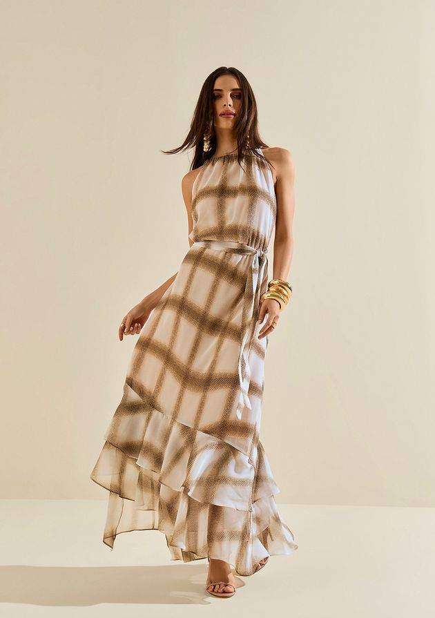 Vestido Morena Rosa Solto Decote Reto Sem Alça Longo Bege