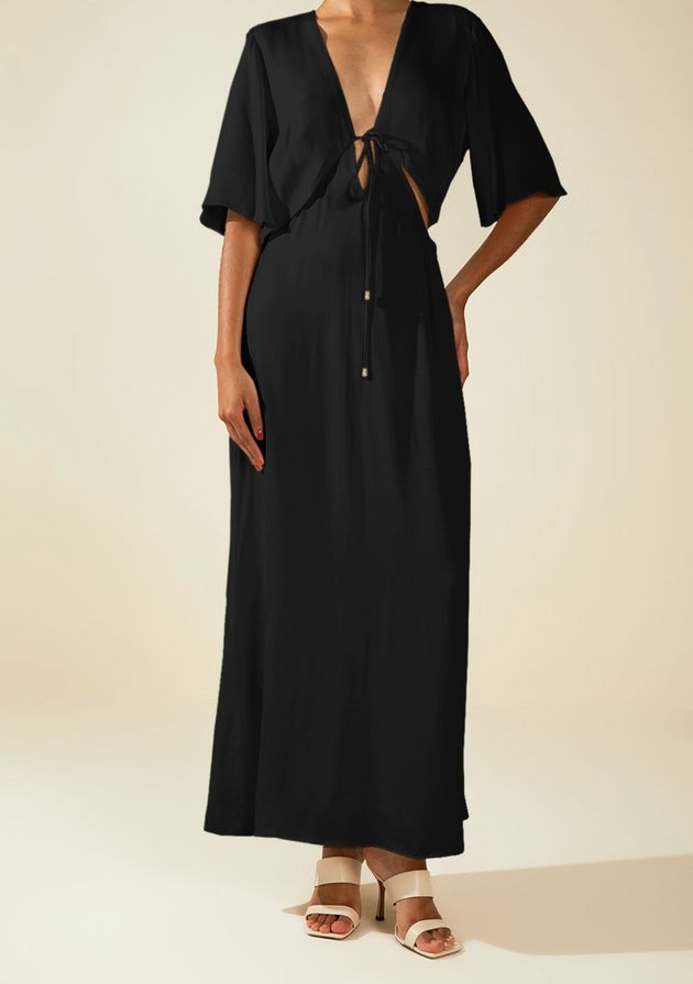 Vestido Morena Rosa Ajustado Decote V Manga Curta Longo Preto