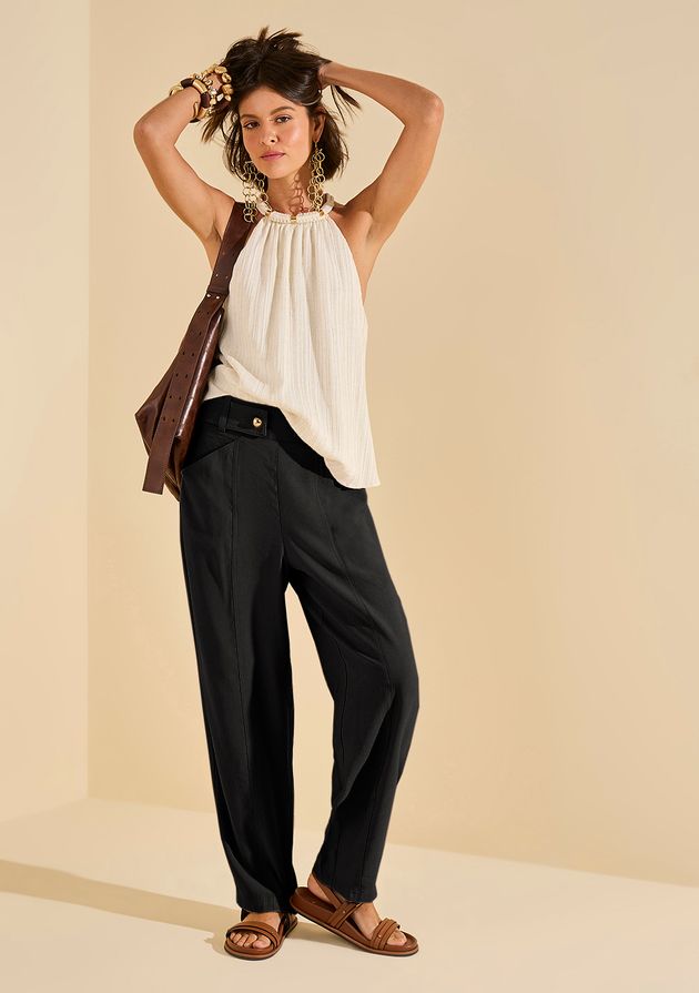 Regata Morena Rosa Solta Decote Transpassado Alongada Preto