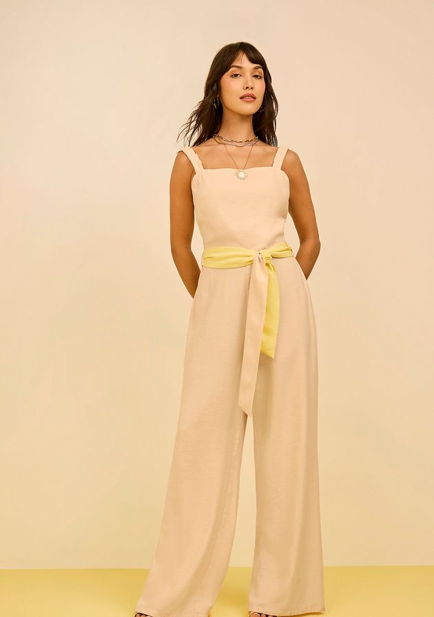 Macacão Zinco Ajustado Decote Reto Sem Manga Longo Bege