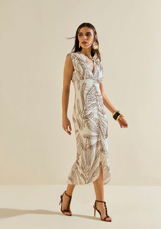 Vestido Morena Rosa Ajustado Decote V Sem Manga Midi Off White
