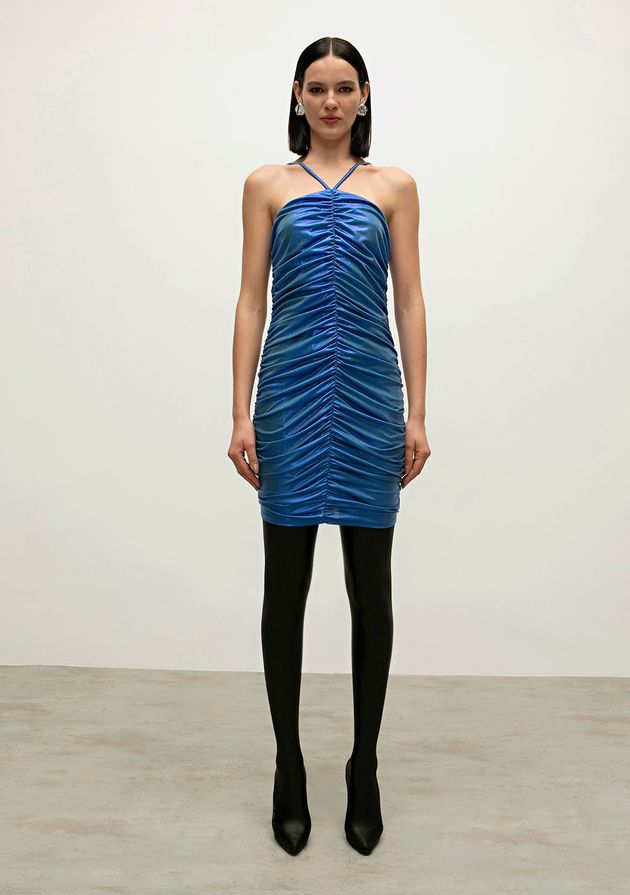 Vestido Iódice Curto Frente Única Com Drapeado Azul