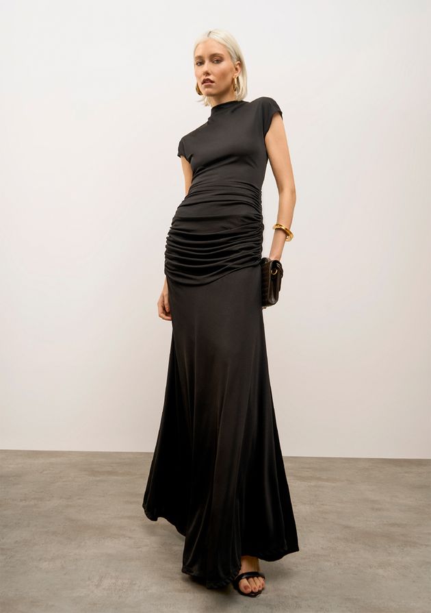 Vestido Iódice Ajustado Gola Alta Manga Curta Longo Preto
