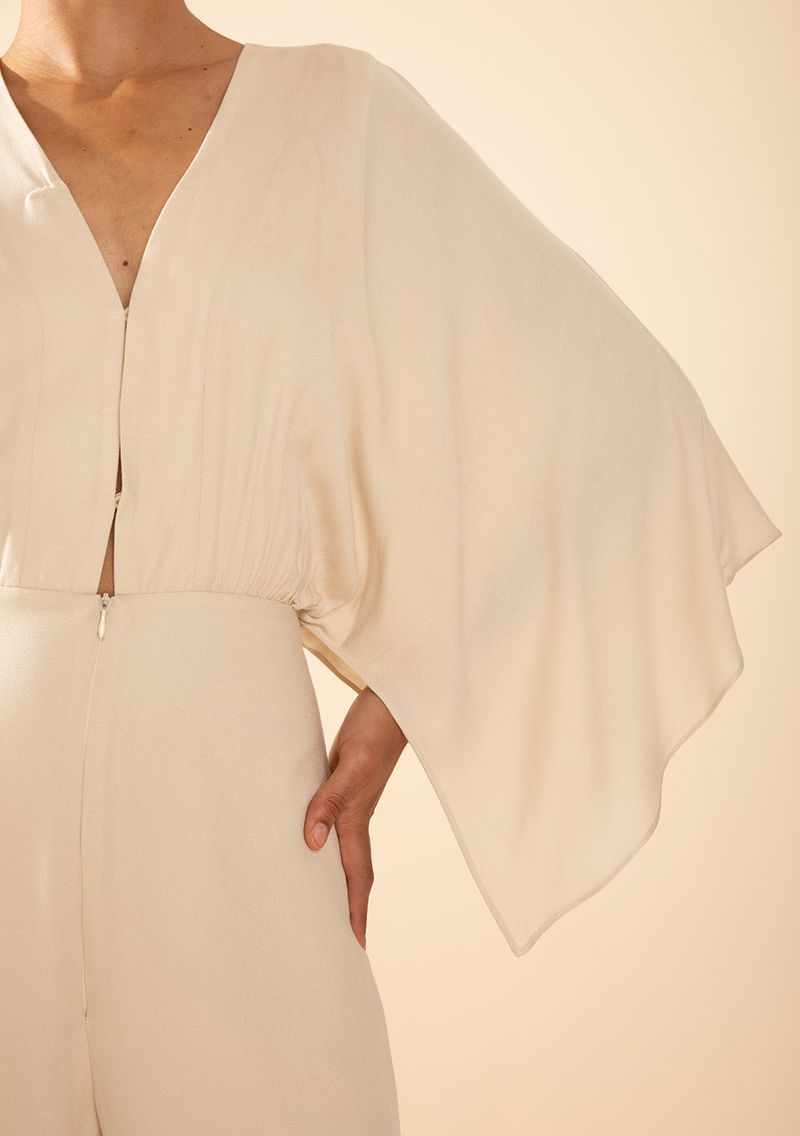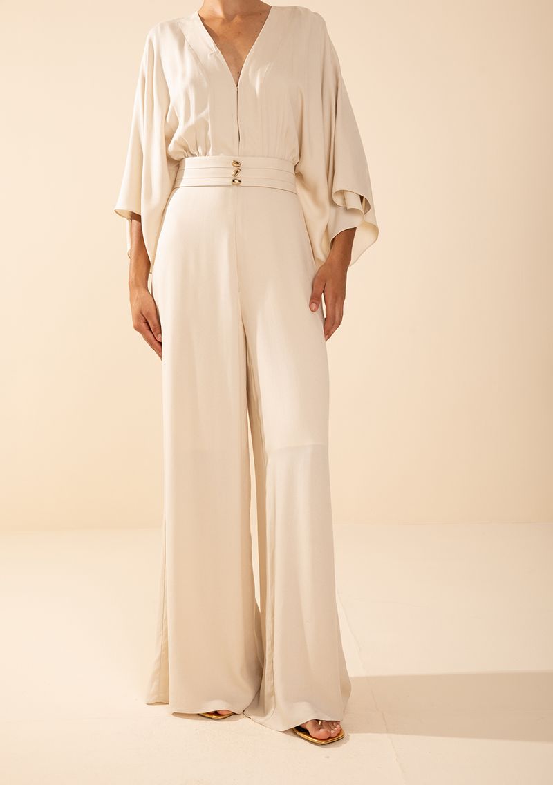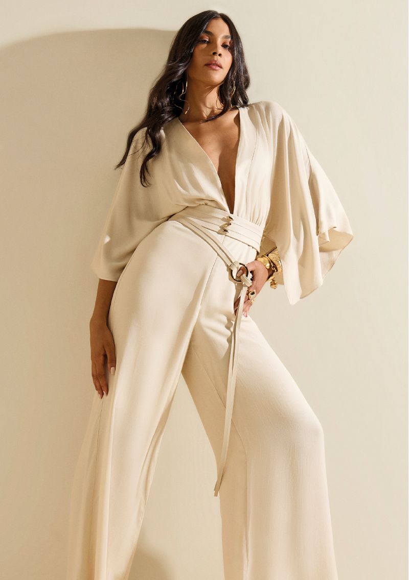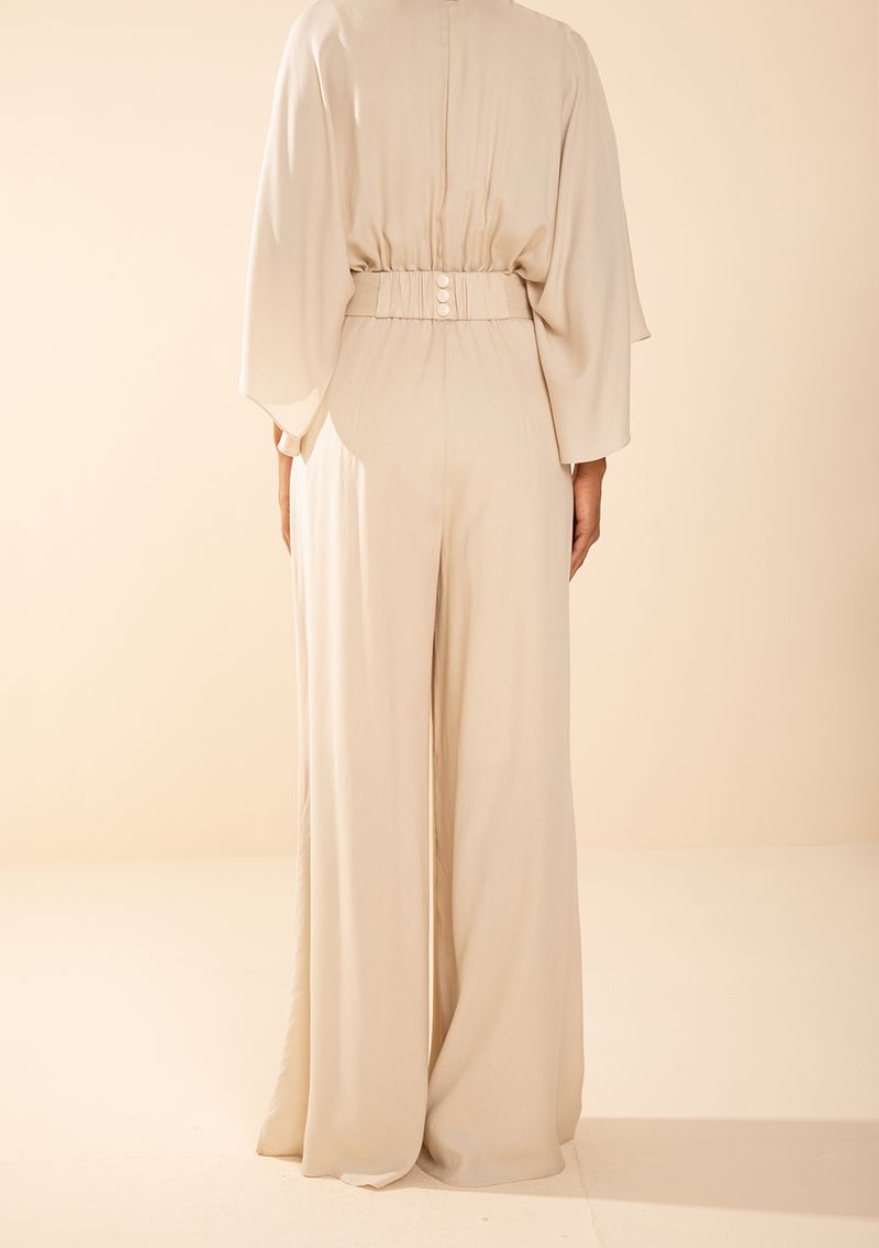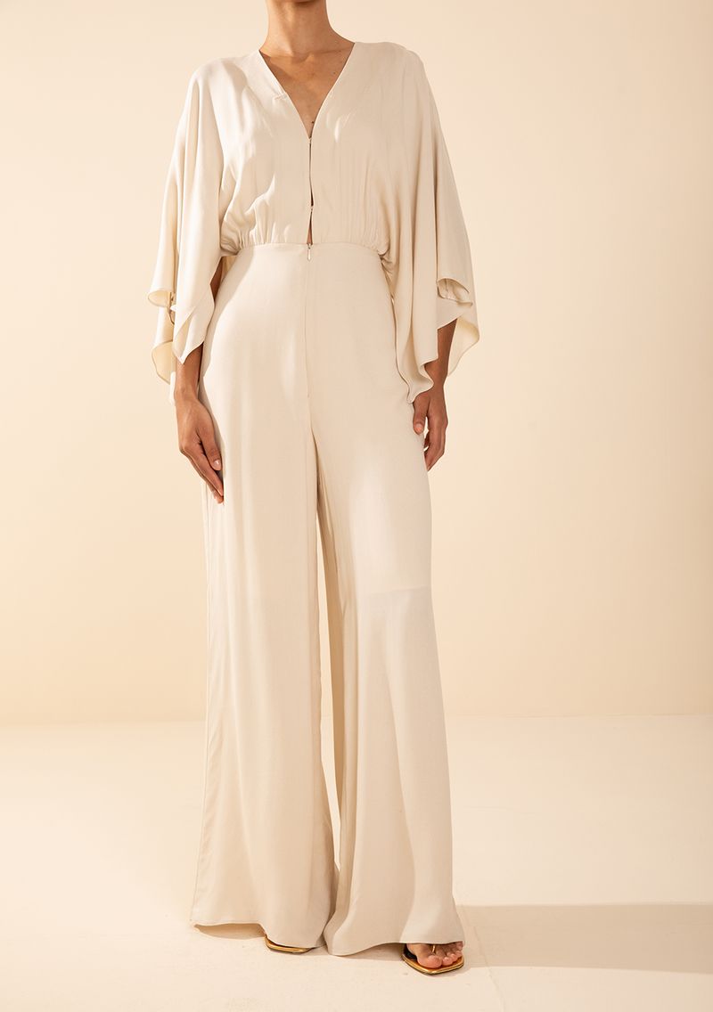 Macacão Morena Rosa Solto Decote V Manga Longa Longo Bege