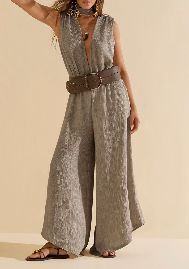 Macacão Morena Rosa Solto Decote V Sem Manga Longo Cinza