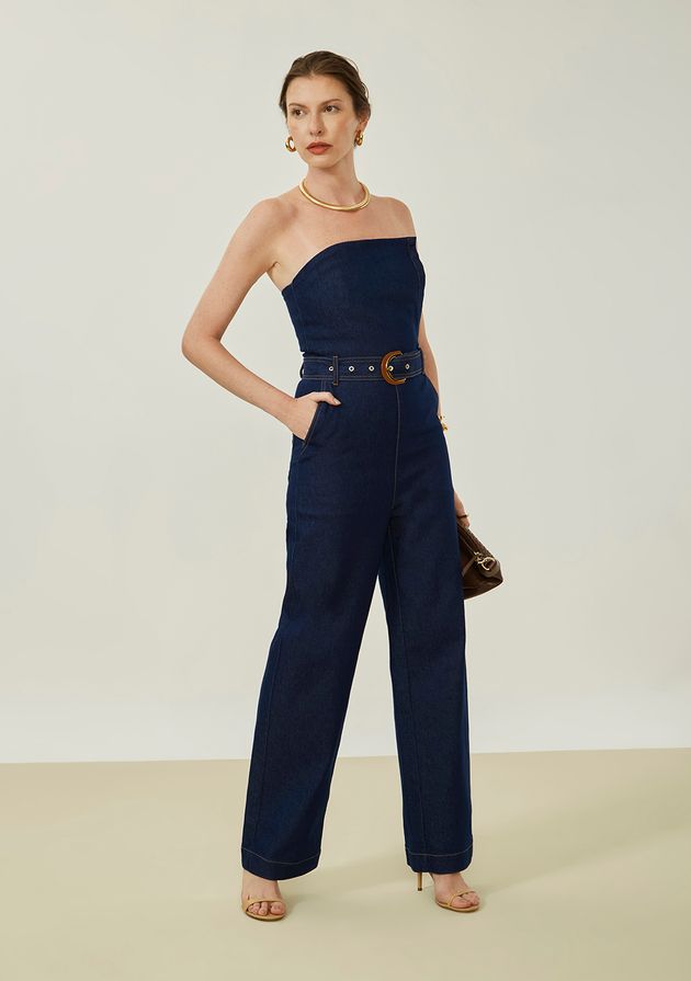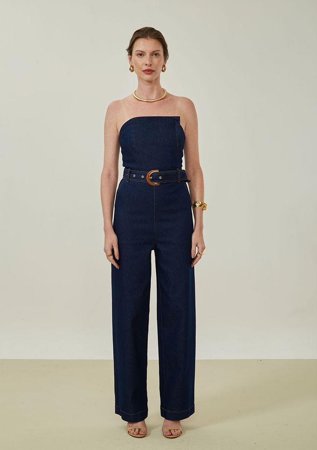 Macacão Maria.Valentina Ajustado Ombro A Ombro Sem Manga Longo Azul