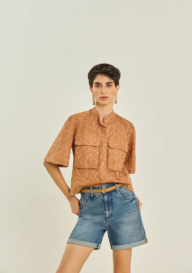 Camisa Maria.Valentina Solta Gola Padre Manga Longa Padrão Marrom