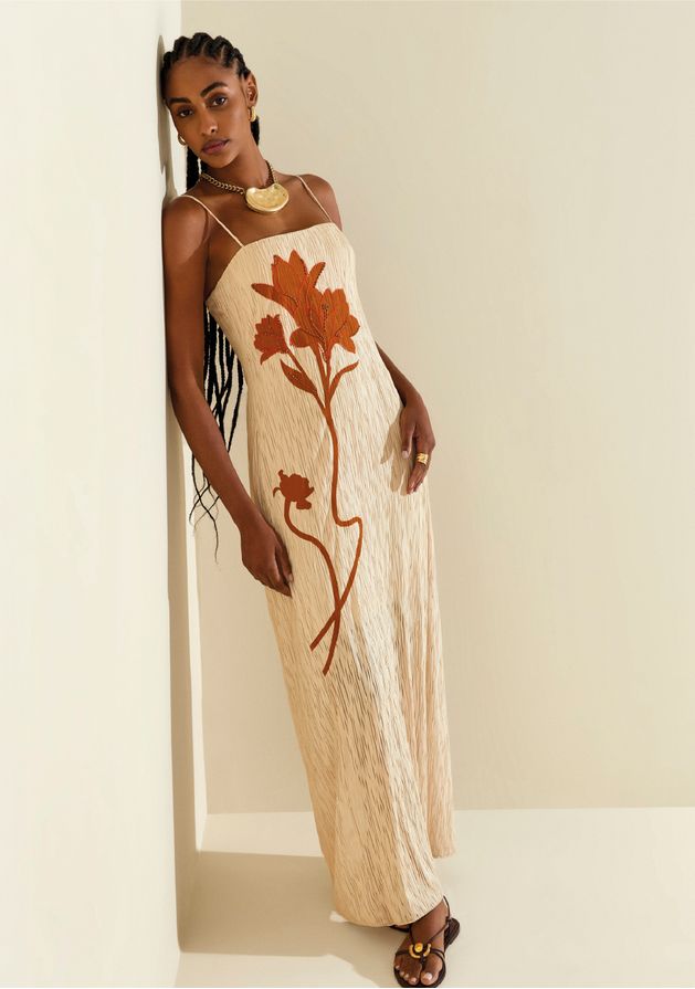 Vestido Morena Rosa Ajustado Decote Reto Com Alça Longo Bege