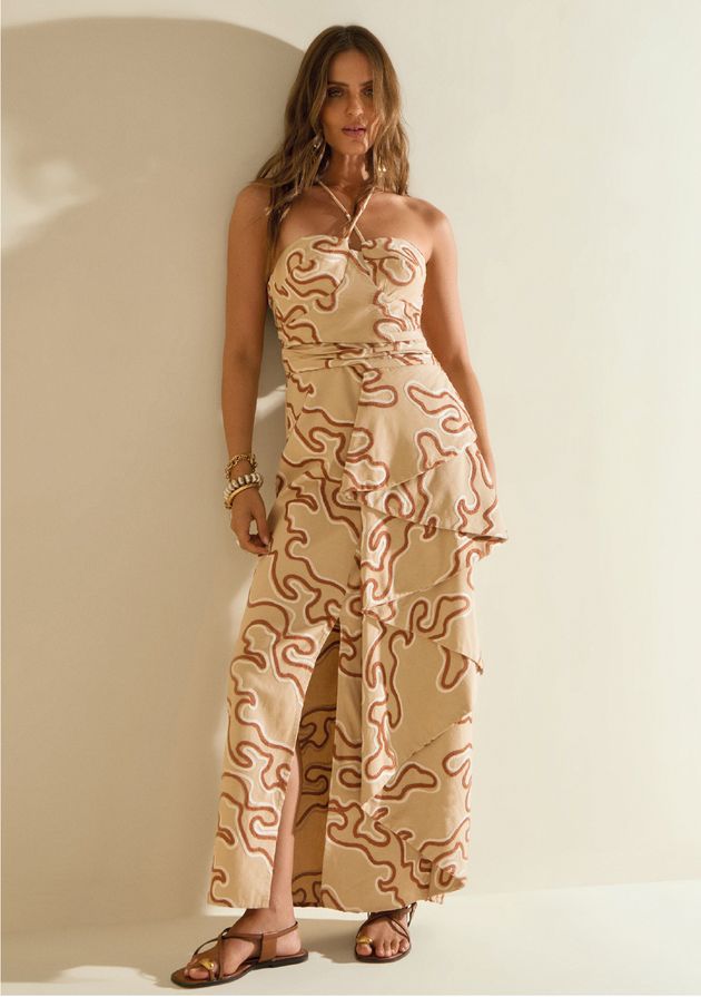 Vestido Morena Rosa Ajustado Decote Reto Sem Manga Midi Bege