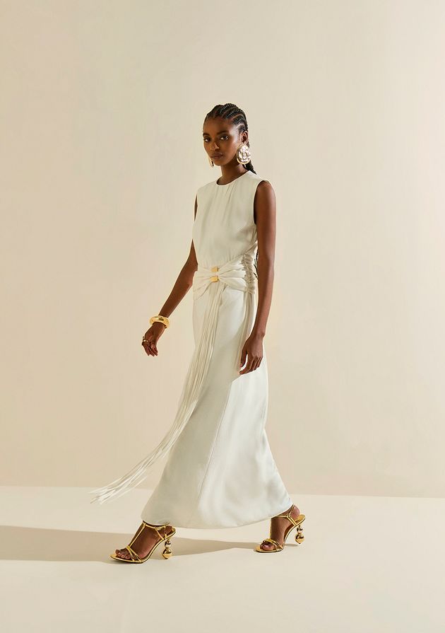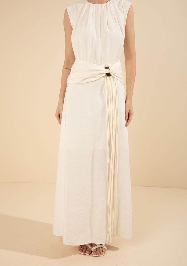 Vestido Morena Rosa Solto Decote Careca Manga Curta Longo Off White
