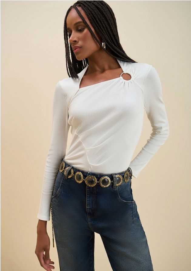 Blusa Morena Rosa Ajustada Decote Reto Manga Longa Padrão Off White