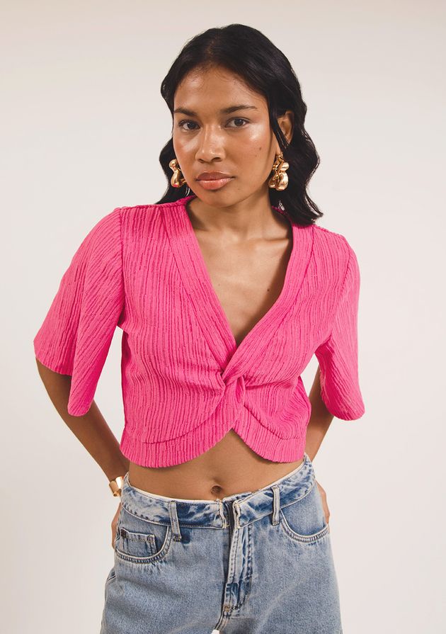 Blusa Zinco Decote V Manga Curta Detalhe Torção Rosa