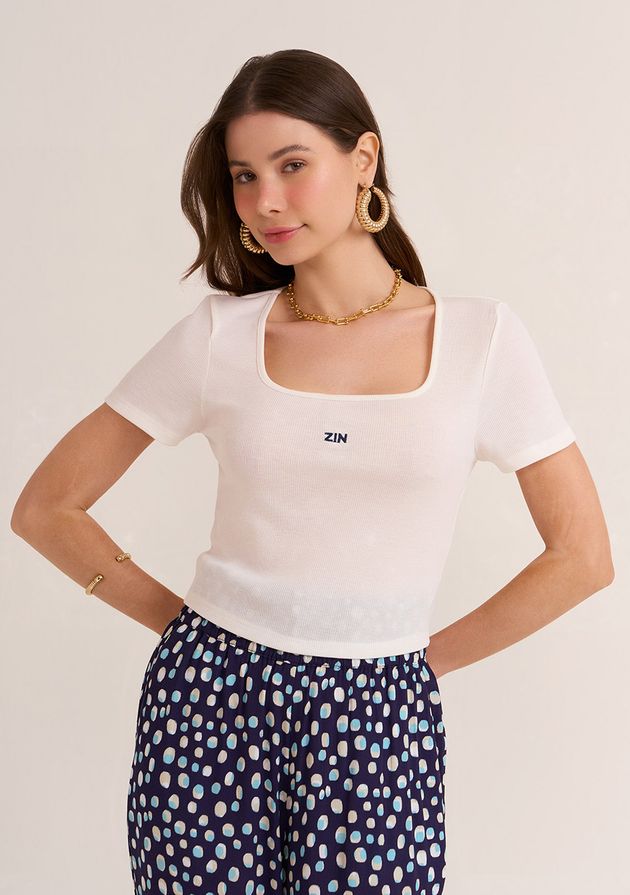 Blusa Zinco Decote Redondo Manga Curta Básica Off White
