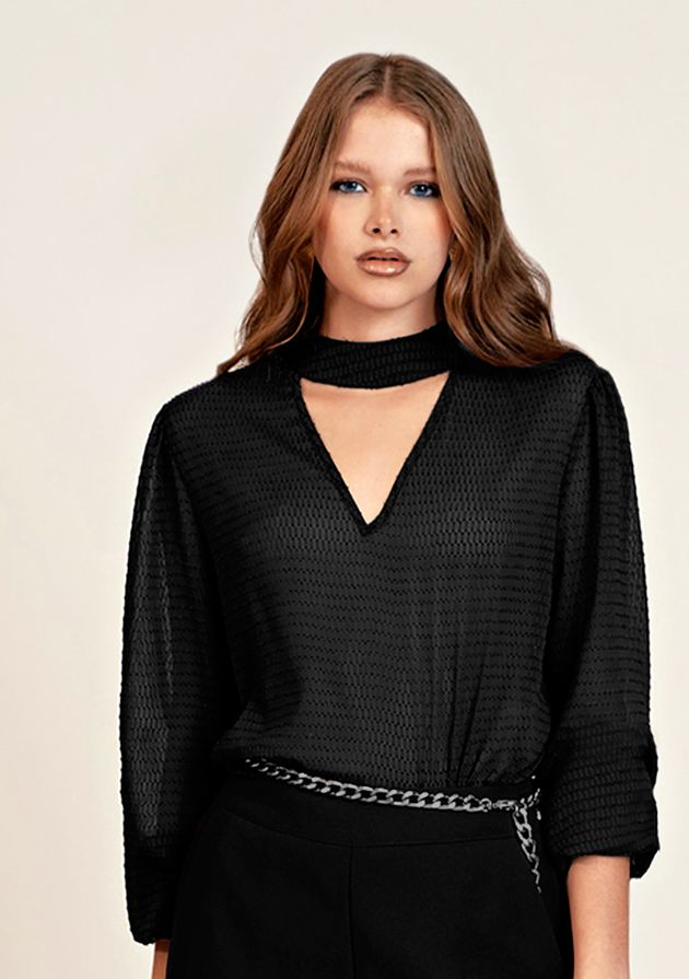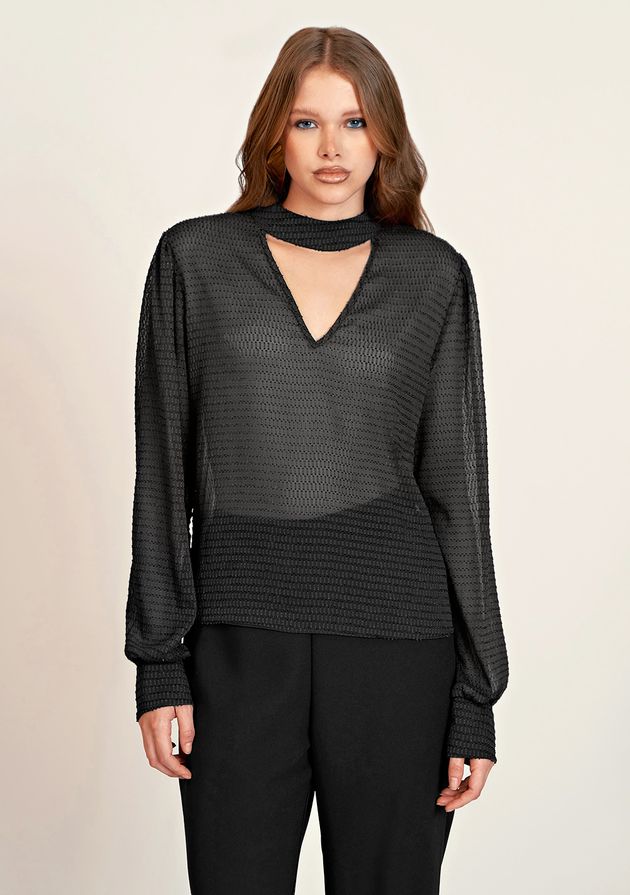 Blusa Zinco Reta Decote Amarração Manga Longa Com Franzido Preto