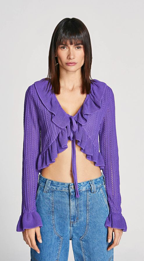 Blusa Morena Rosa Decote Amarração Manga Longa Com Babado Roxo