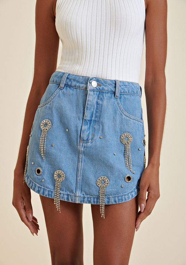 Saia Morena Rosa Curta Five Pockets Bordado Manual Jeans