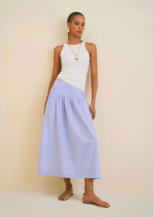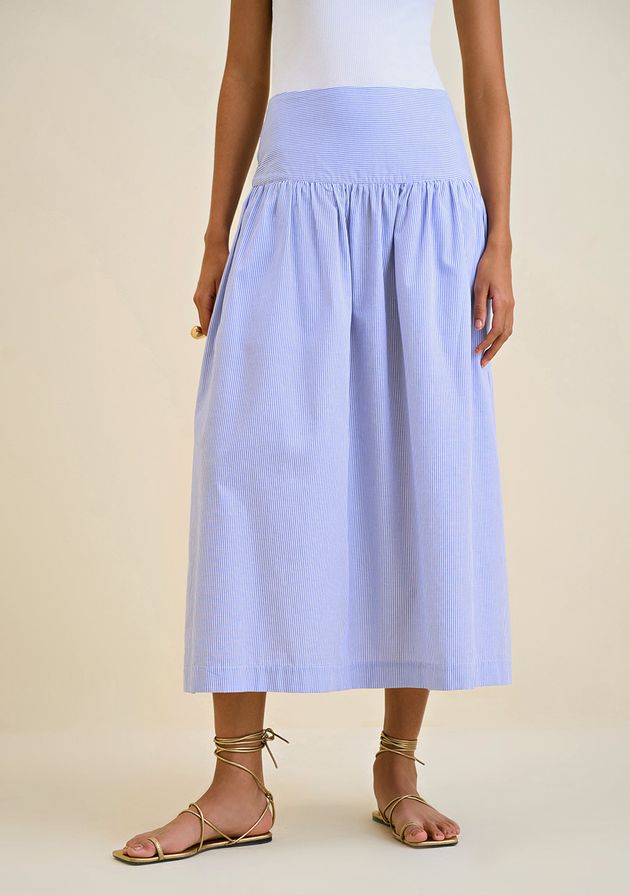 Saia Morena Rosa Curta Linha A Mix De Tecidos Azul