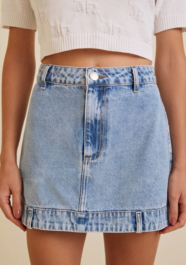 Saia Morena Rosa Curta Five Pockets Barra Com Recorte Jeans