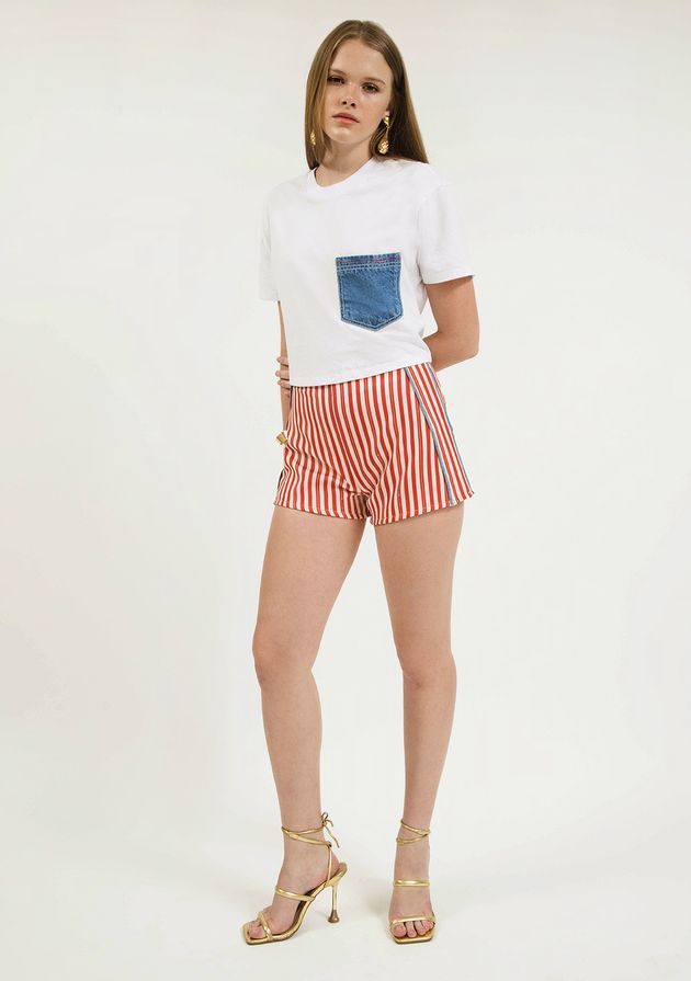 Bermuda Morena Rosa Reta Com Lapela Laranja