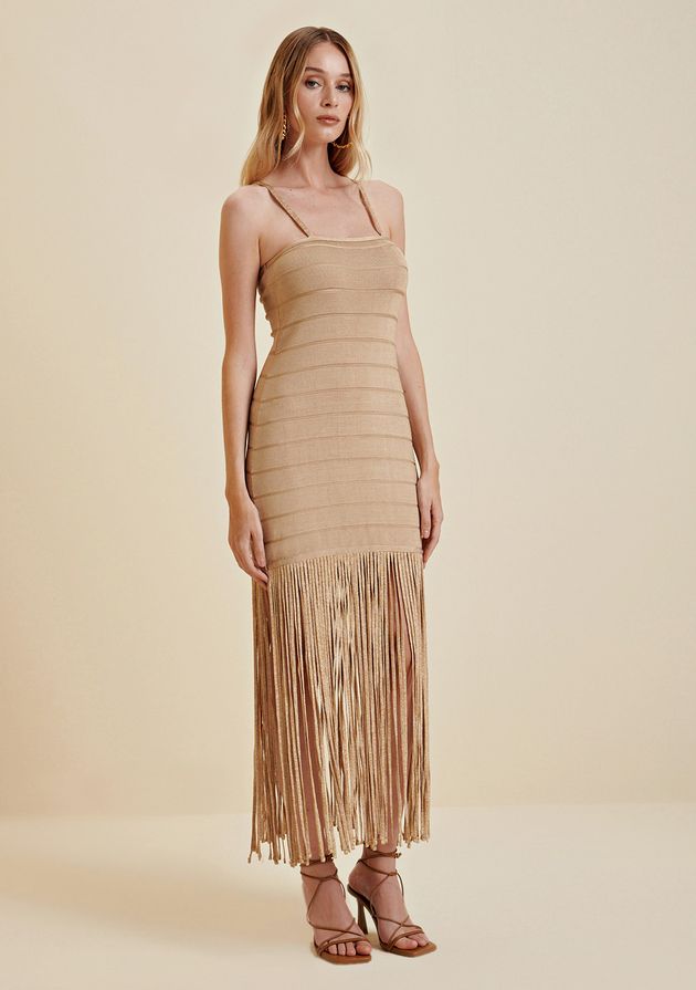 Vestido Morena Rosa Midi Decote Reto Com Franjas Bege
