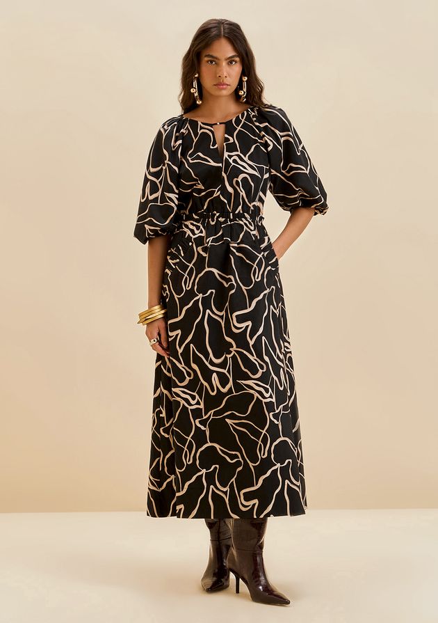 Vestido Morena Rosa Solto Decote Canoa Manga 3 Quartos Midi Preto