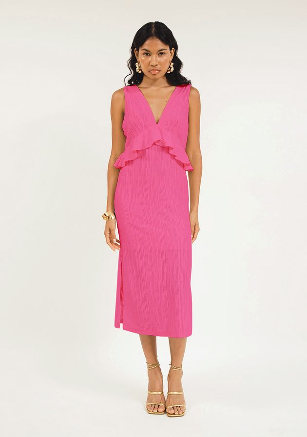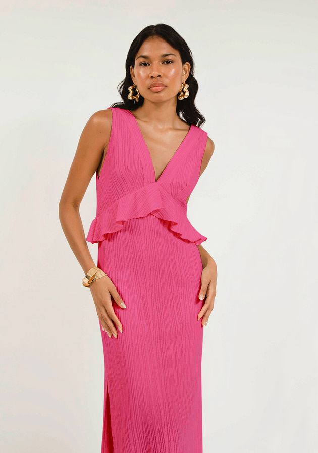 Vestido Zinco Midi Decote V Com Babado Rosa