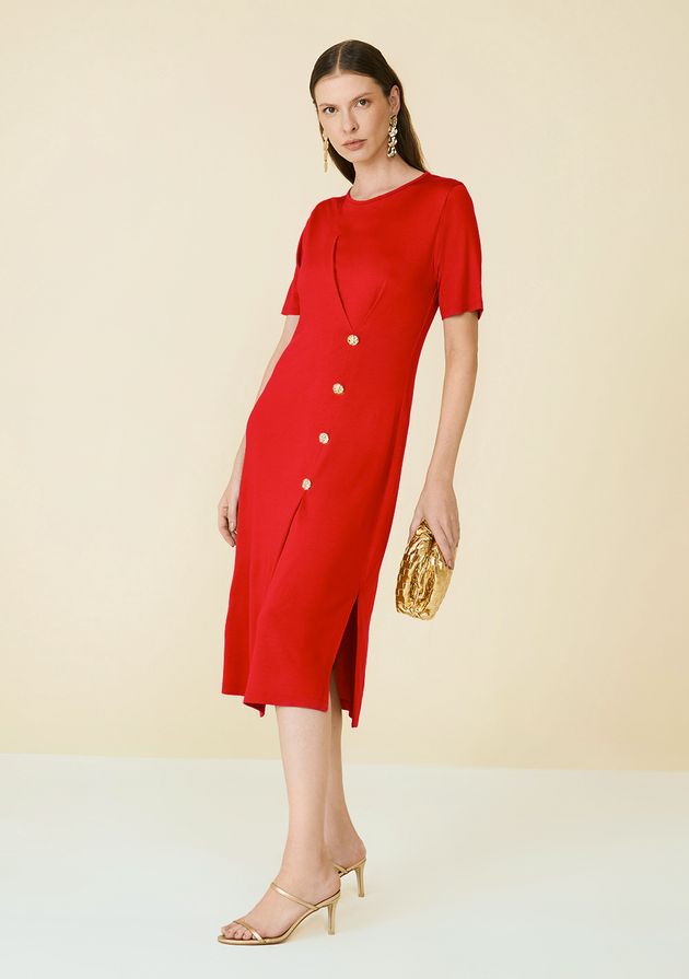 Vestido Maria.Valentina Ajustado Decote Careca Manga Curta Midi Vermelho