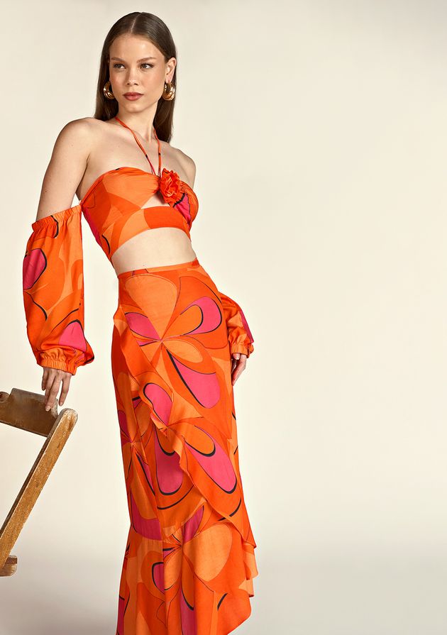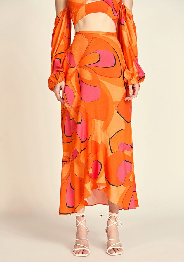 Saia Zinco Midi Fluida Com Babado Laranja