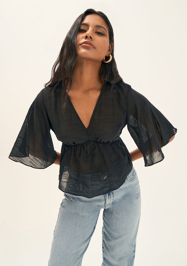 Blusa Zinco Decote V Manga Godê Básica Preto