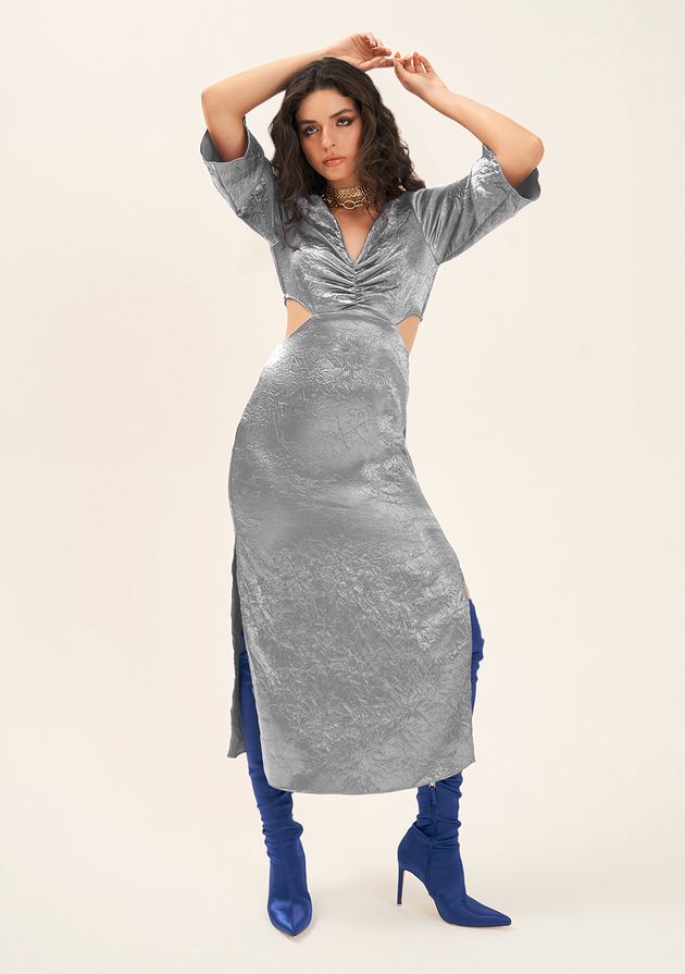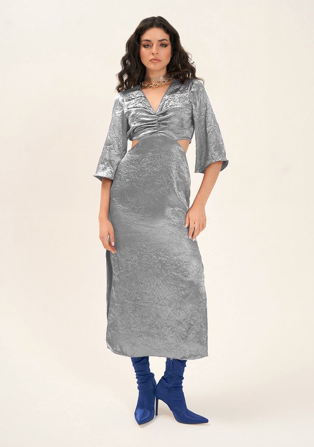Vestido Zinco Midi Decote V Detalhe Frente Prata