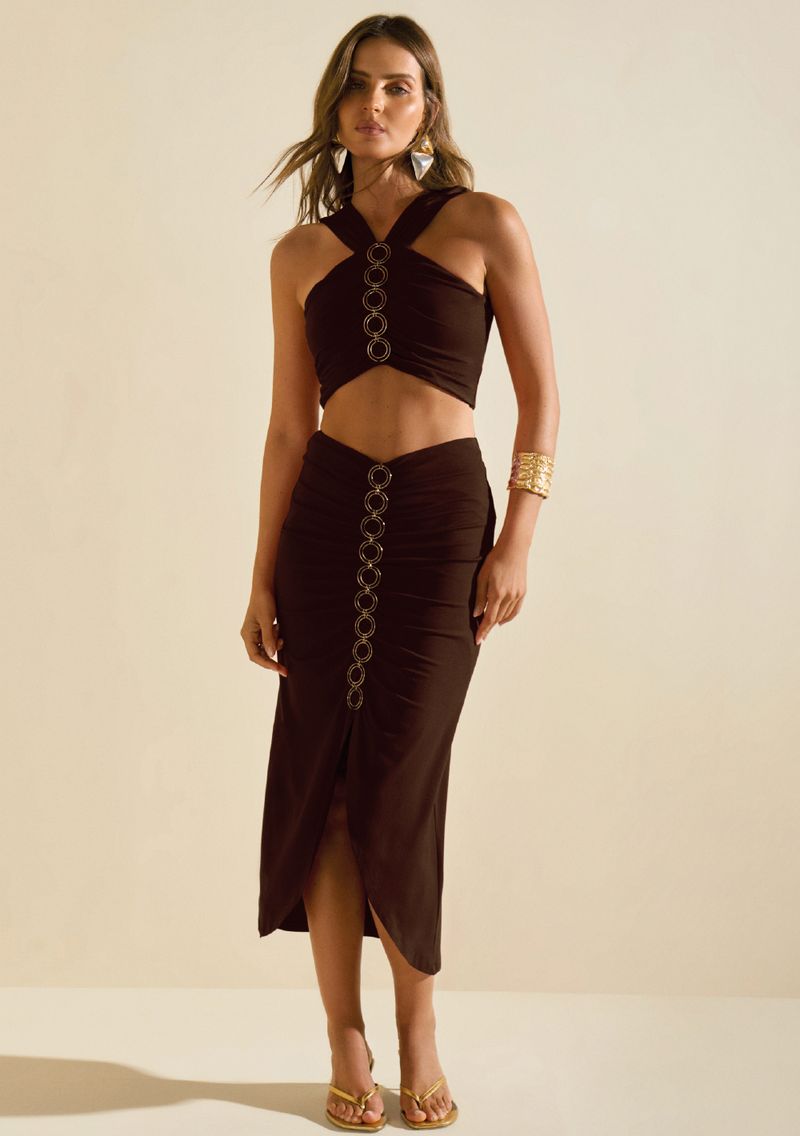 Saia Morena Rosa Reta Alta Midi Marrom