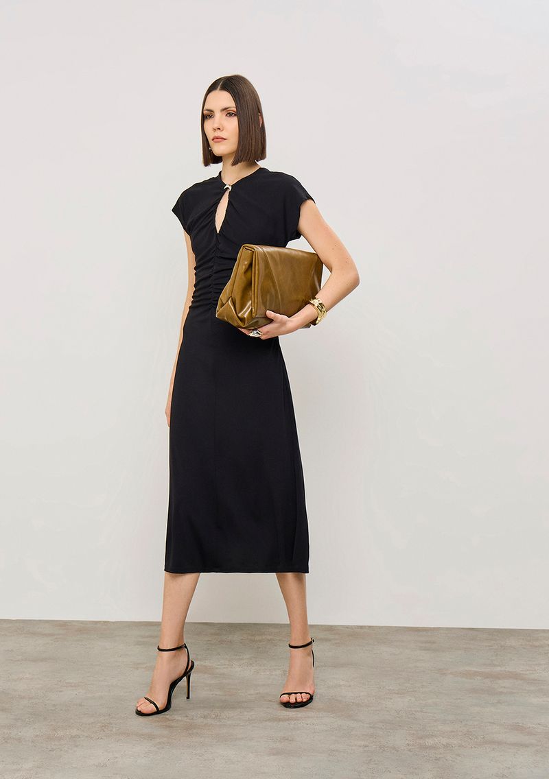 Vestido Iódice Ajustado Decote Careca Manga Curta Midi Preto