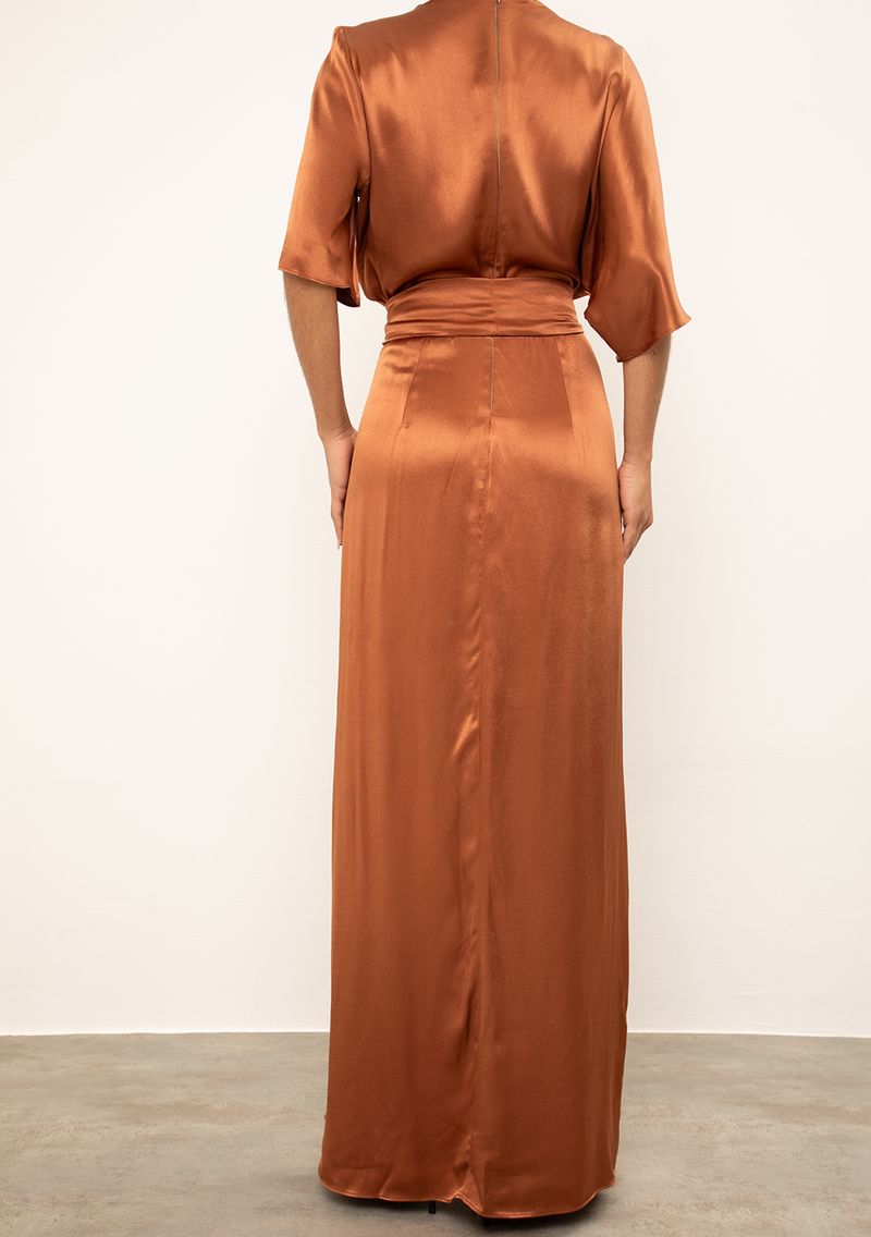 Vestido Iódice Solto Decote Canoa Manga Curta Longo Marrom