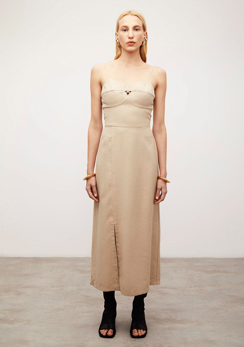 OUTLETFemininoRoupasTricotsVestidosAlfaiatariaVestido Iódice Solto Decote Reto Com Alça Longo Bege