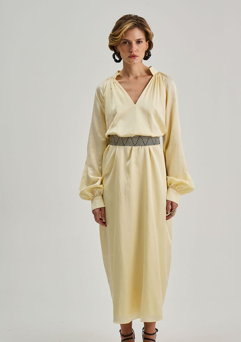 Vestido Iódice Solto Decote V Manga Longa Midi Amarelo