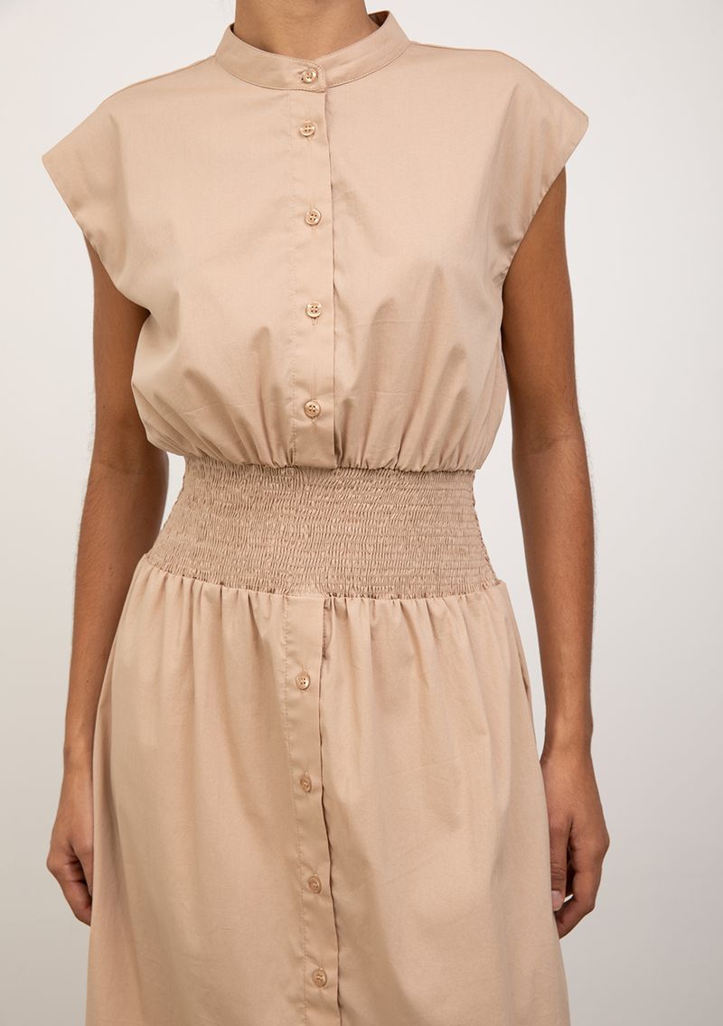 FemininoRoupasTricotsVestidosAlfaiatariaVestido Iódice Solto Gola Clássica Sem Manga Midi Bege