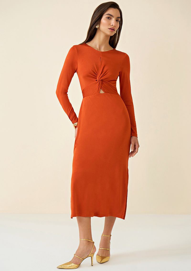 Vestido Maria.Valentina Midi Decote Redondo Torção Frente Laranja