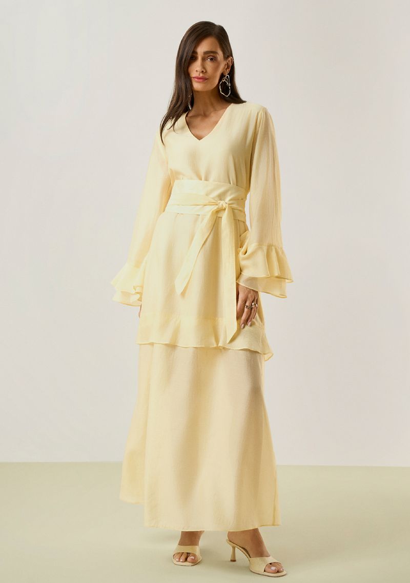 Vestido Maria.Valentina Solto Decote V Manga Longa Longo Amarelo