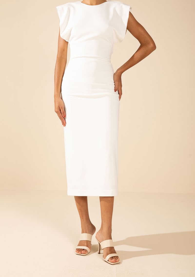 Vestido Morena Rosa Ajustado Decote Careca Manga Curta Midi Off White
