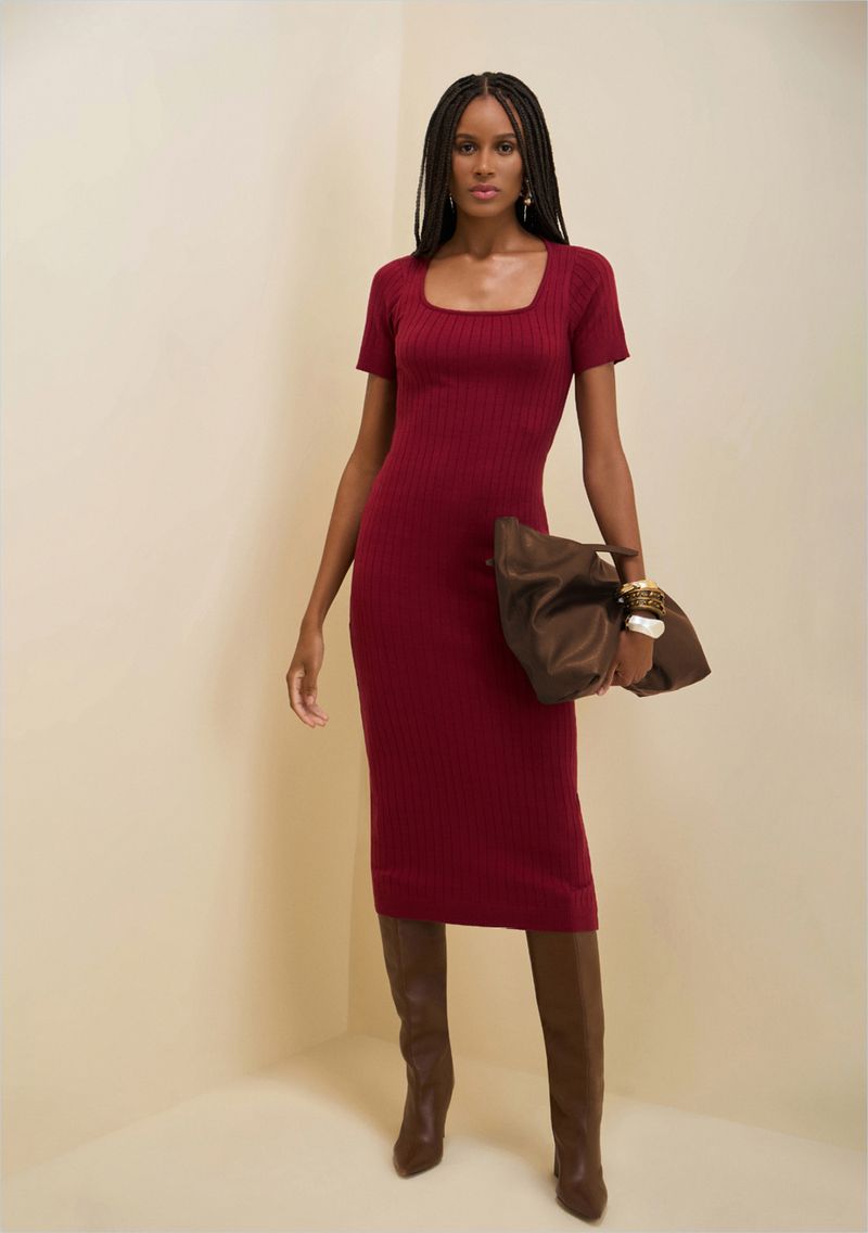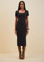 OUTLETFemininoRoupasVestidosVestido Morena Rosa Ajustado Decote Reto Manga Curta Midi Bordo