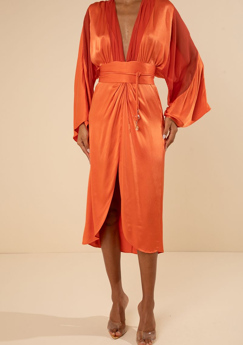 FemininoRoupasVestidosVestido Morena Rosa Ajustado Decote V Manga Longa Midi Laranja