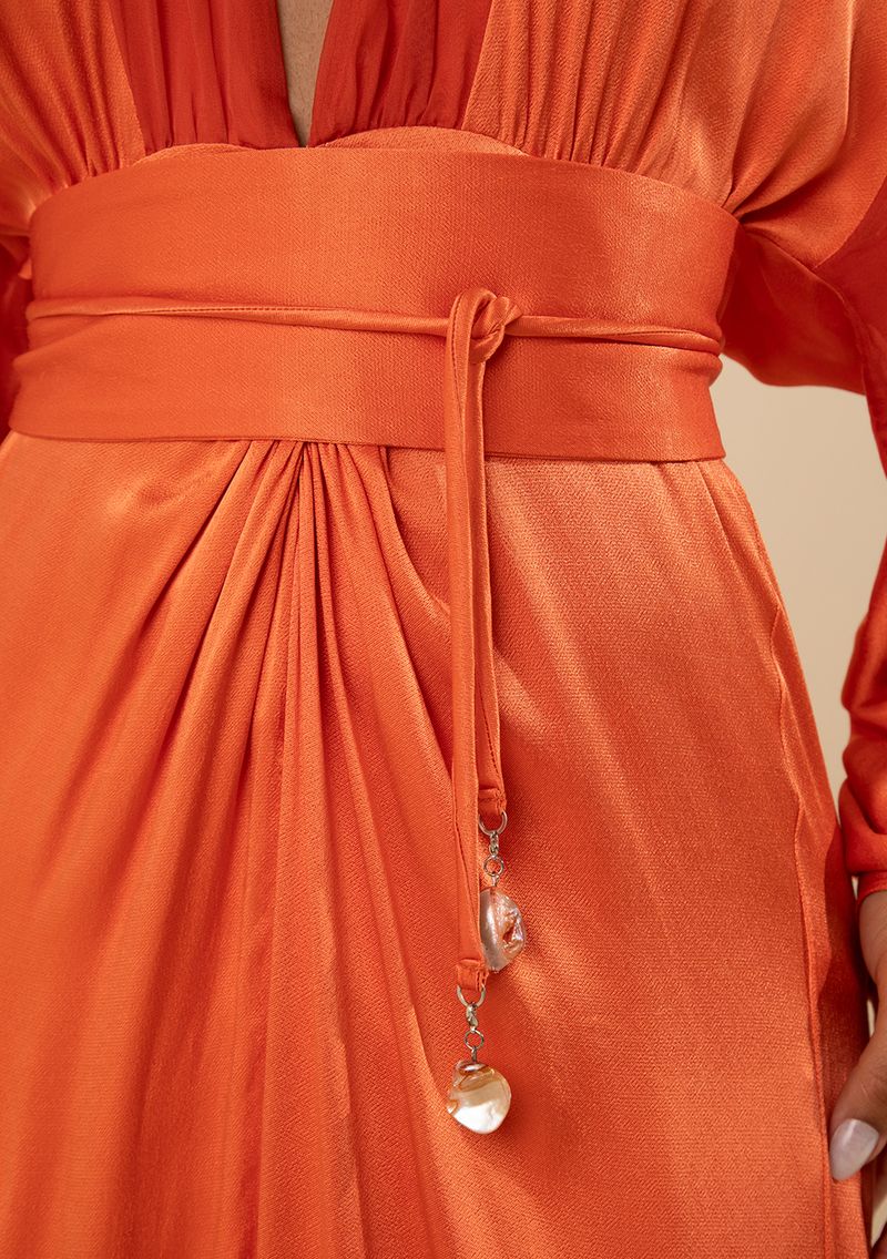 Vestido Morena Rosa Ajustado Decote V Manga Longa Midi Laranja