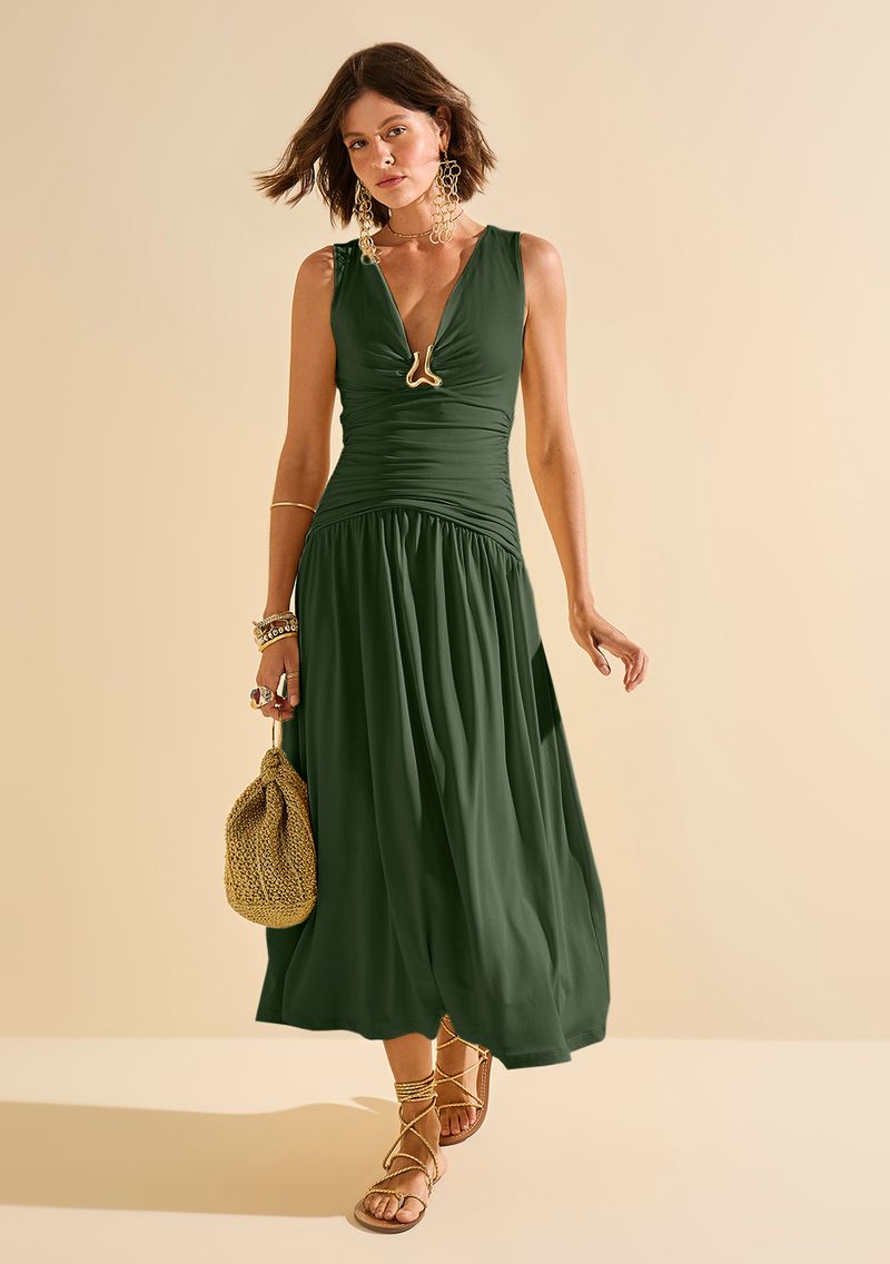 Vestido Morena Rosa Ajustado Decote V Sem Manga Midi Verde